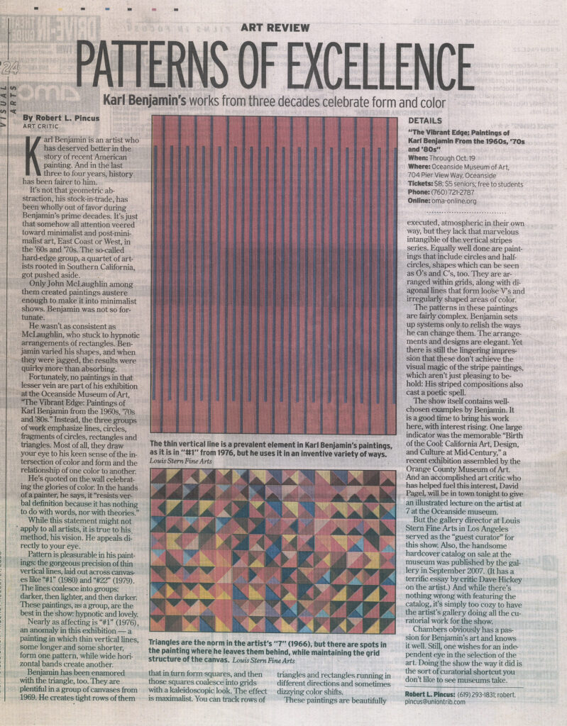 Michno, Christopher. “Karl Benjamin: The Vibrant Edge.” THE: LA’s Monthly Magazine for the Arts (October 2008), reproduced in color on page 51.