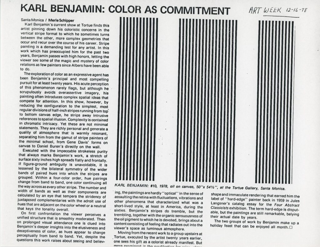 Schipper, Merle. “Karl Benjamin: Color as Commitment.” Artweek, 16 December 1978.