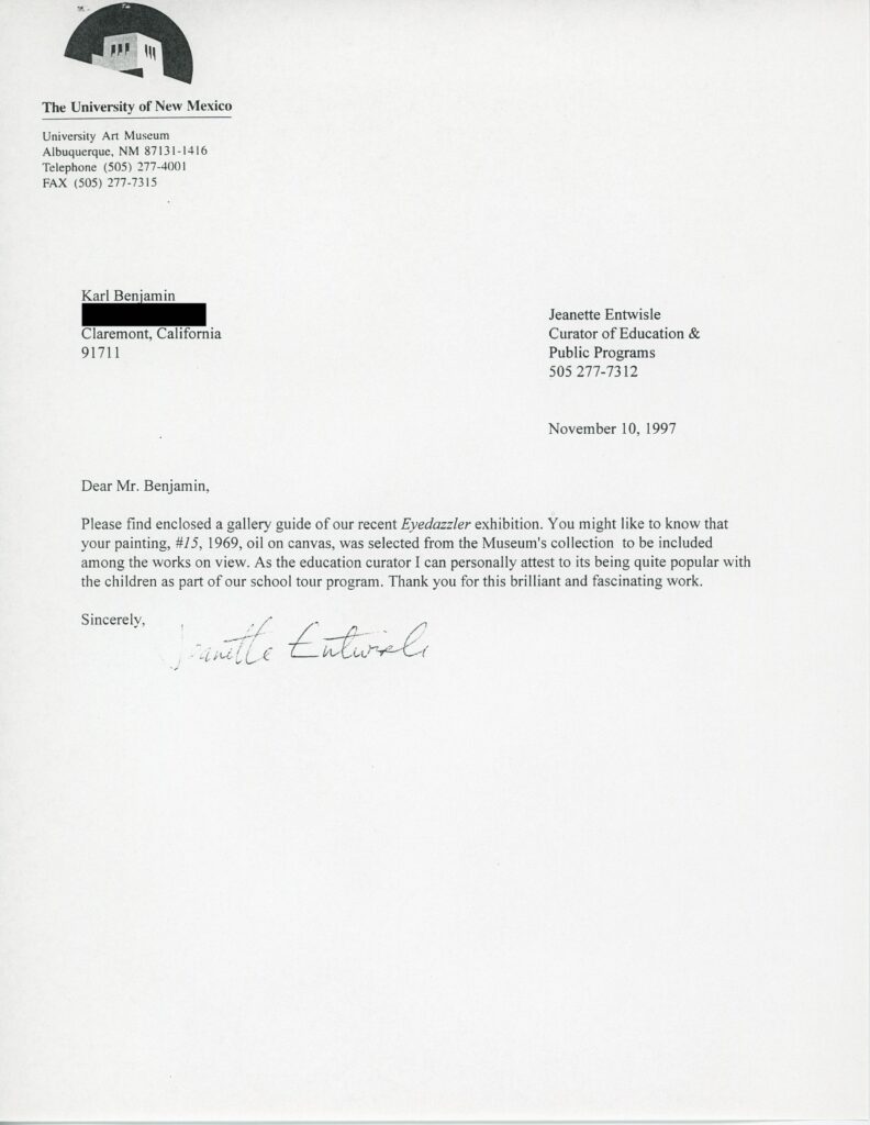 Entwisle, Jeanette. Letter to Karl Benjamin. 10 November 1997. University of New Mexico Eyedazzler Exhibition. Karl Benjamin Archives.