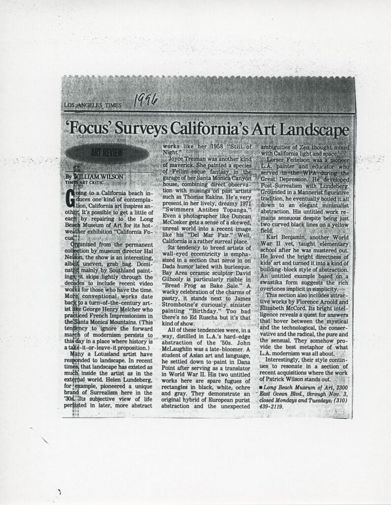 Wilson, William. “‘Focus’ Surveys California’s Art Landscape.” Los Angeles Times, 16 August 1996.