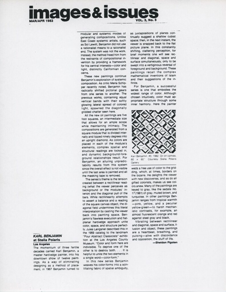 Figoten, Sheldon. “Karl Benjamin at Stella Polaris.” Images & Issues, vol. 3, no. 5, (March-April 1983).